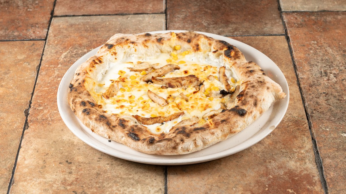 Με λευκή κρέμα, παρμεζάνα, κοτόπουλο, μανιτάρια, mozzarella, gorgonzola και τρουφόλαδο
