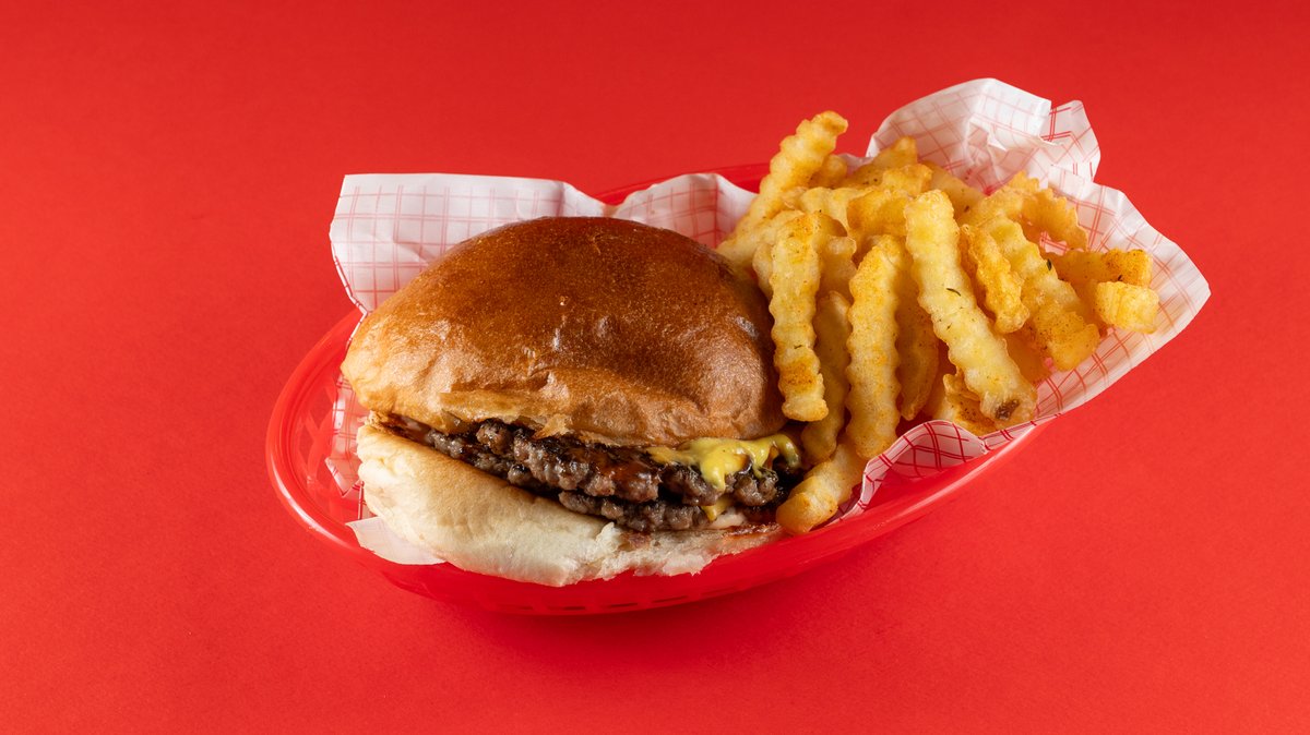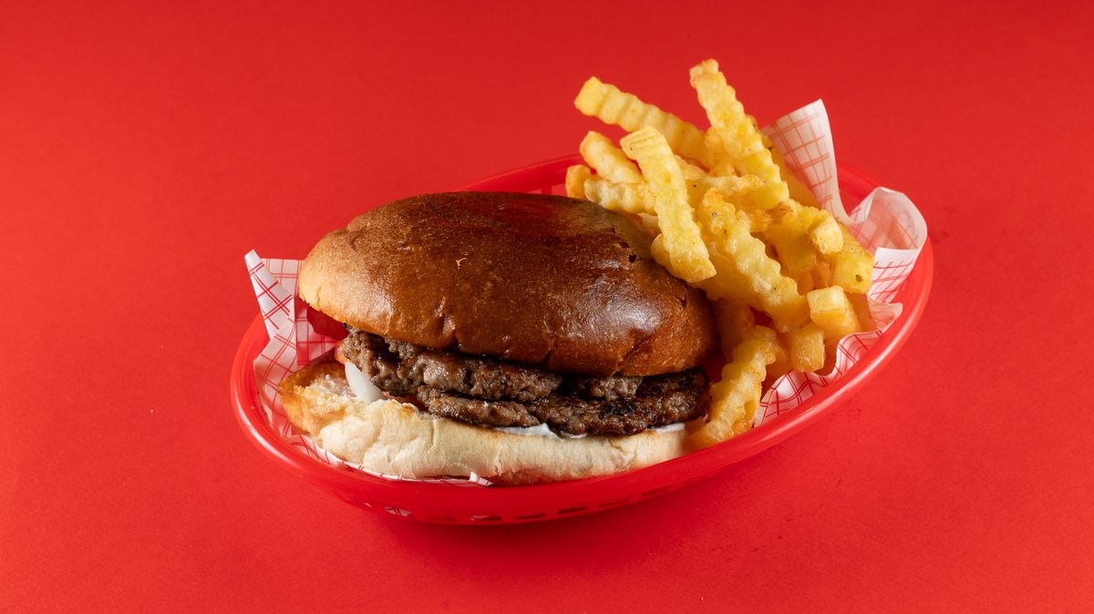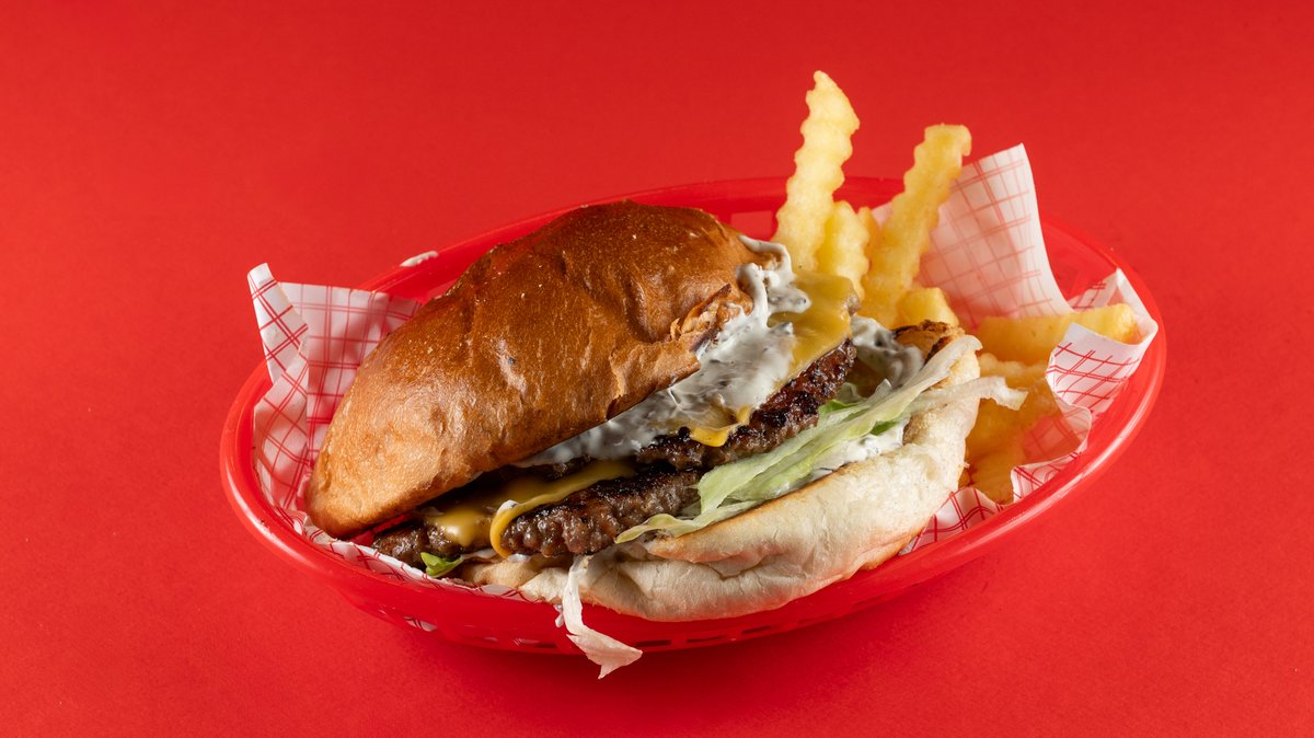 Διπλό μοσχαρίσιο μπιφτέκι smashed, διπλό cheddar, secret σως, μουστάρδα, κέτσαπ, ψωμάκι brioche. Συνοδεύεται από πατάτες τηγανητές