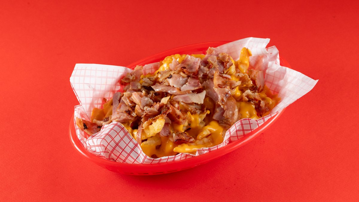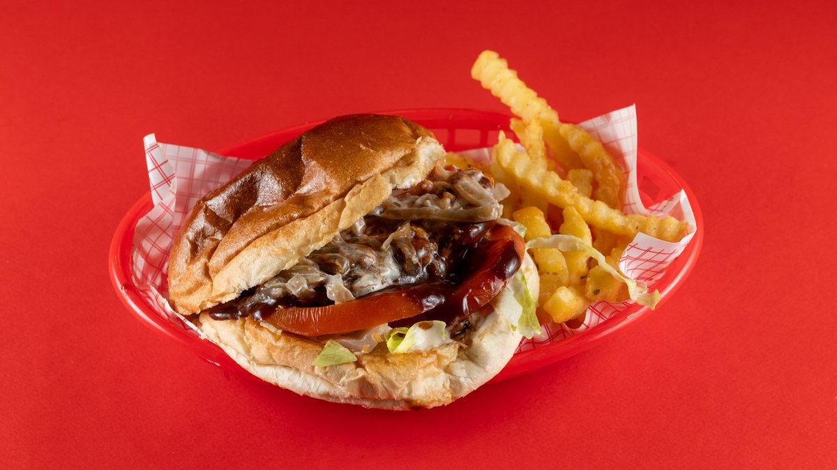 Διπλό μοσχαρίσιο μπιφτέκι smashed, διπλό cheddar, iceberg, ντομάτα, μπέικον, καραμελωμένο κρεμμύδι, μαγιονέζα, σως bbq, ψωμάκι brioche. Συνοδεύεται από πατάτες τηγανητές