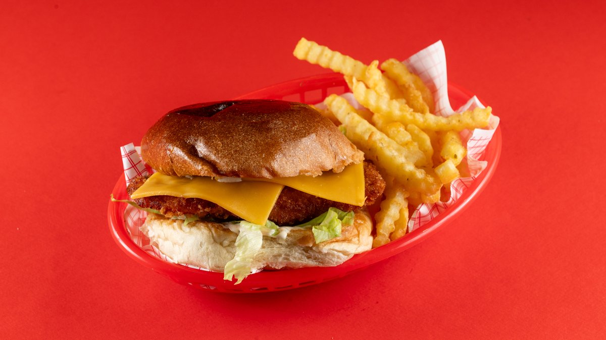 Τραγανό τηγανητό φιλέτο κοτόπουλο, iceberg, cheddar, μπέικον, secret τσίκεν σως, ψωμάκι brioche. Συνοδεύεται από πατάτες τηγανητές