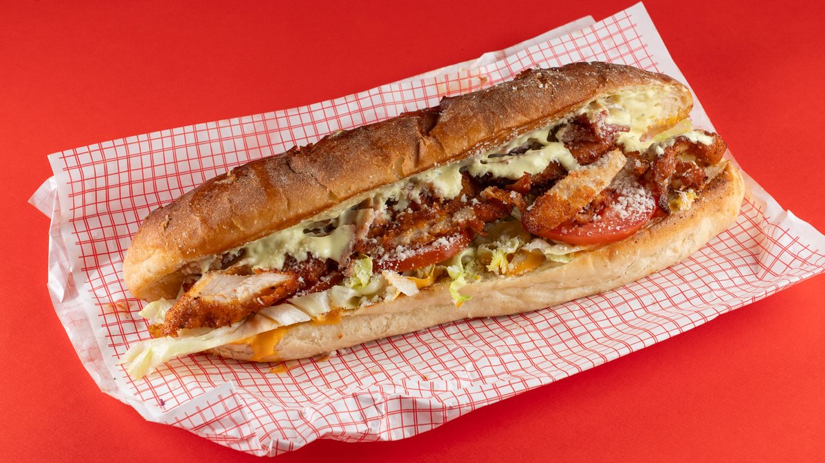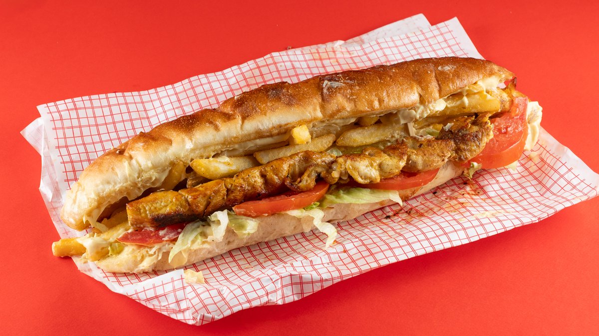 Με ψωμάκι 35 εκατοστά, φιλέτο προβατίνας, σως αγιόλι, ντομάτα, σως φέτας και κρεμμύδι