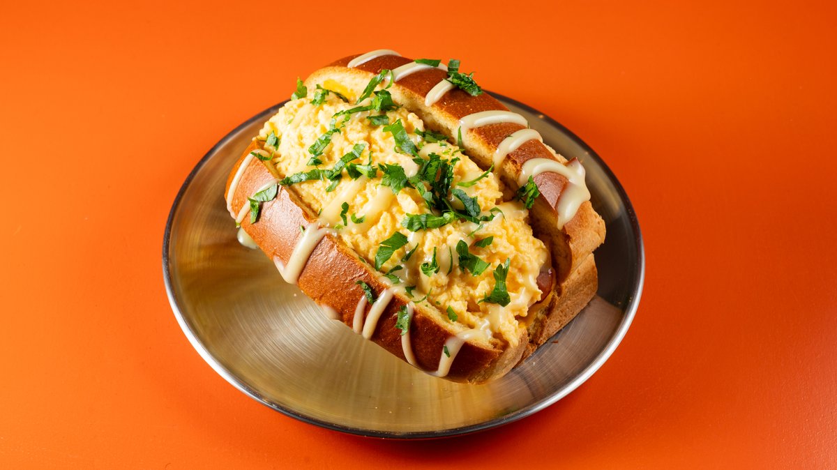 Με lobster bread, scrambled egg, μπέικον, τσένταρ και egg drop sauce