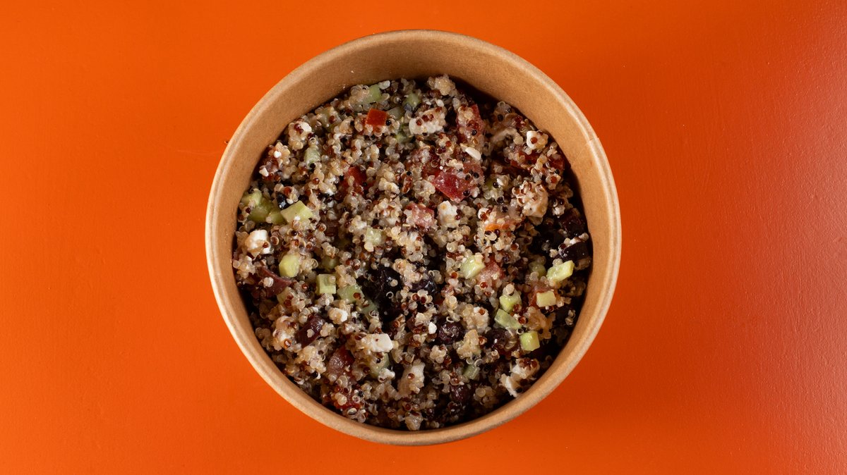Κινοα, αγγούρι, ντοματίνια, φέτα, και χυμός λεμονιού