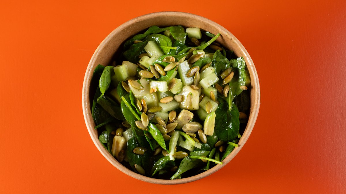 Βaby σπανάκι ,αβοκάντο, άγγουρι, κολοκυθόσπορος, πράσινο μήλο και χυμός λεμονιού