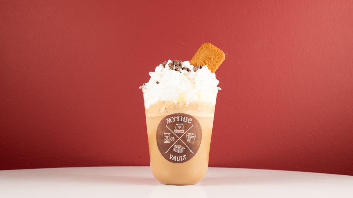 Espresso, milk, chocolate couverture, chocolate syrup and biscoff creme