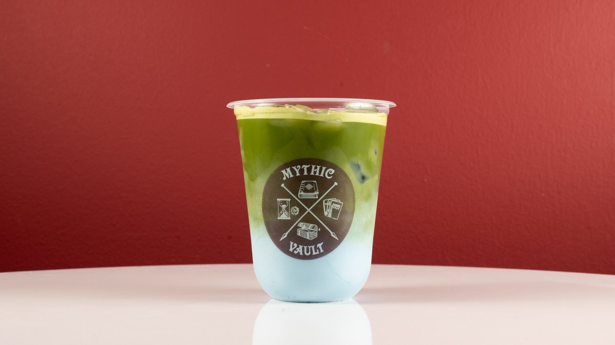 Matcha, butterfly pea tea, coconut milk and caramel syrup