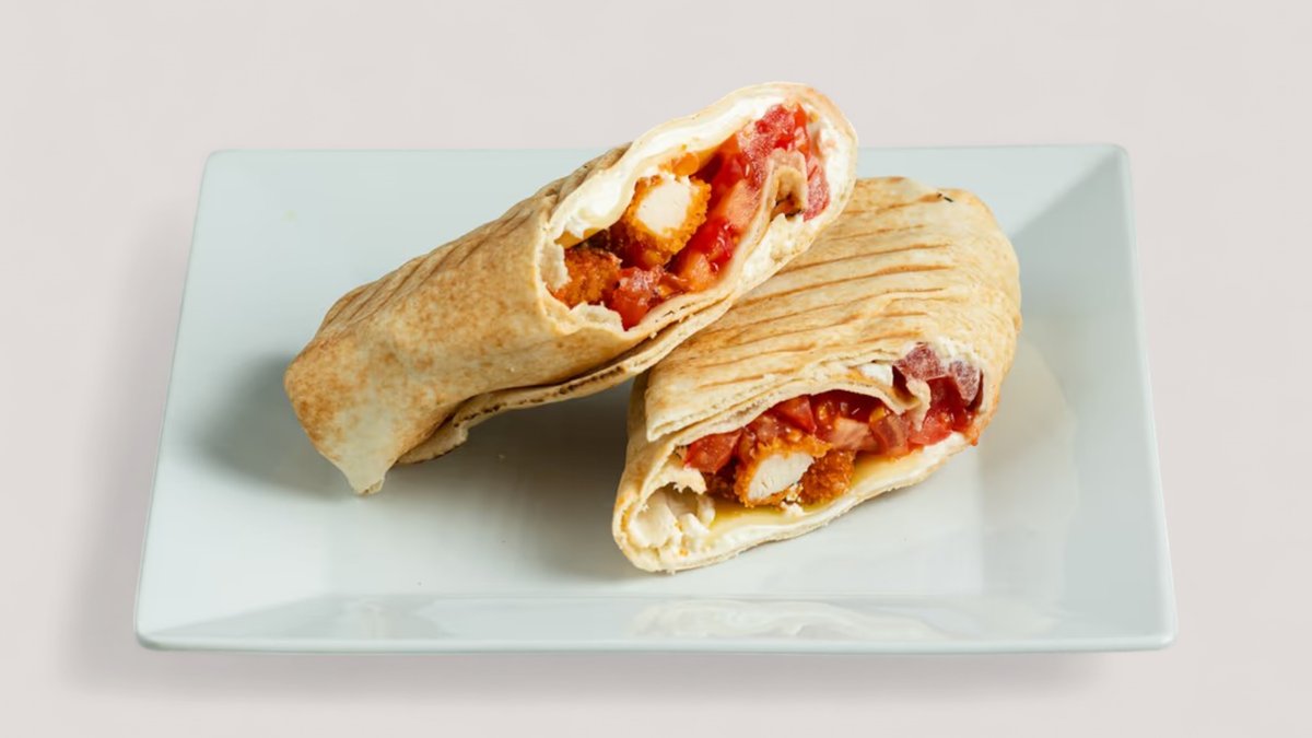Με κοτοσαλάτα, μαρούλι, ντομάτα, cheddar, sriracha sauce