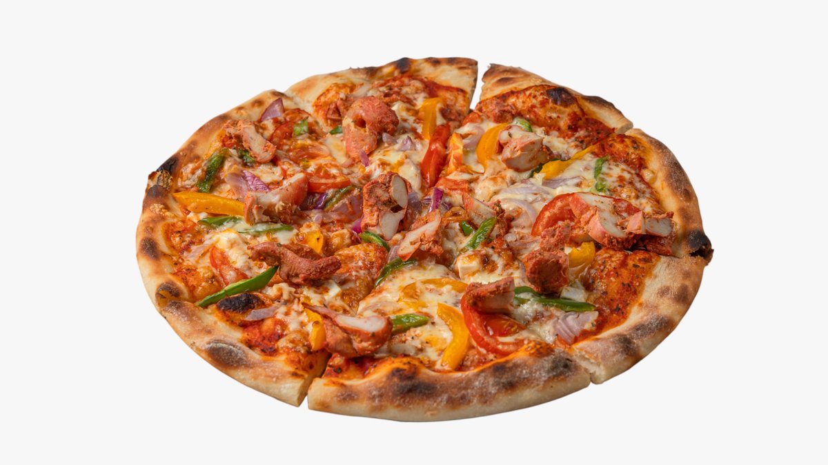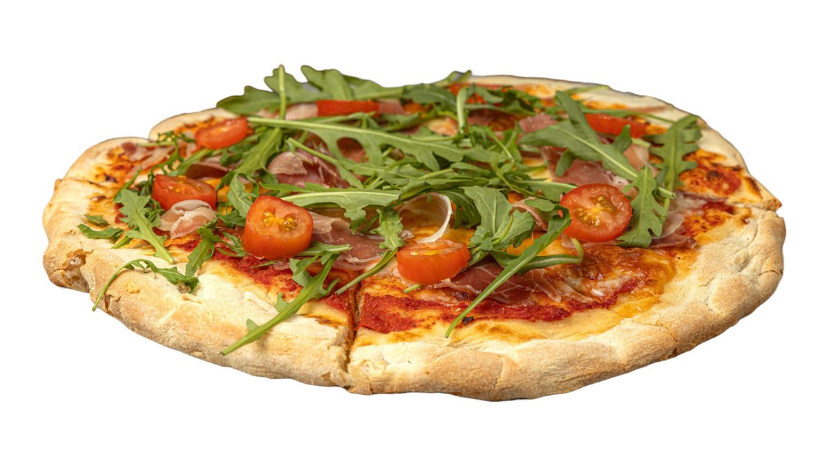 Με σάλτσα ντομάτας, gouda, ζαμπόν, μπέικον, σαλάμι πεπερόνι, μανιτάρια και πράσινη πιπεριά