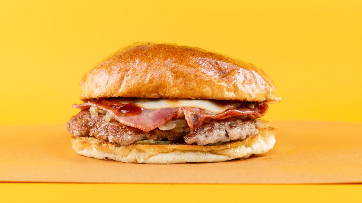 Ψωμάκι brioche με 2 μοσχαρίσια μπιφτέκια των 100gr, cheddar, bacon, ντομάτα, iceberg, ceasar sauce