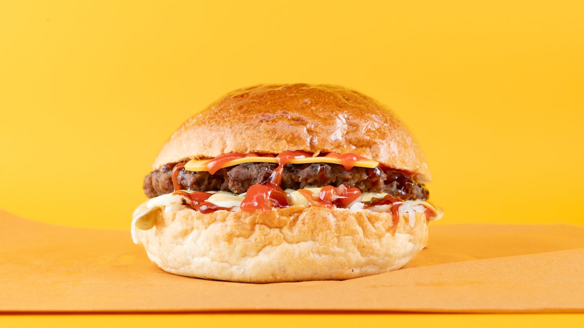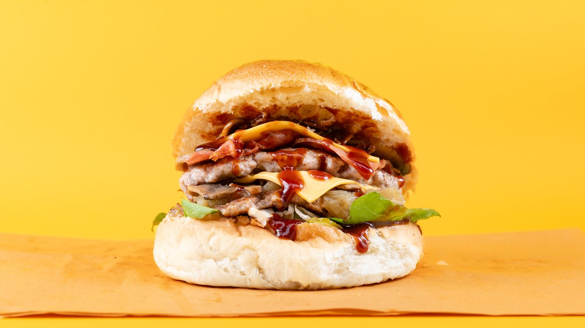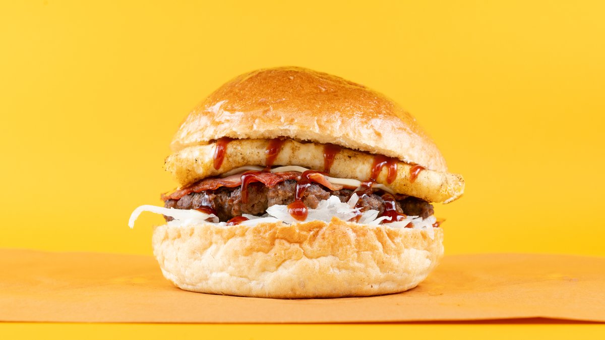 Brioche με μπιφτέκι χειροποίητο από 100 % μοσχαρίσιο κιμά 140 g ψημένο medium well, ομελέτα με καπνιστή μοτσαρέλα, μπέικον, κρέμα Philadelphia, κρεμμύδι και bbq sauce