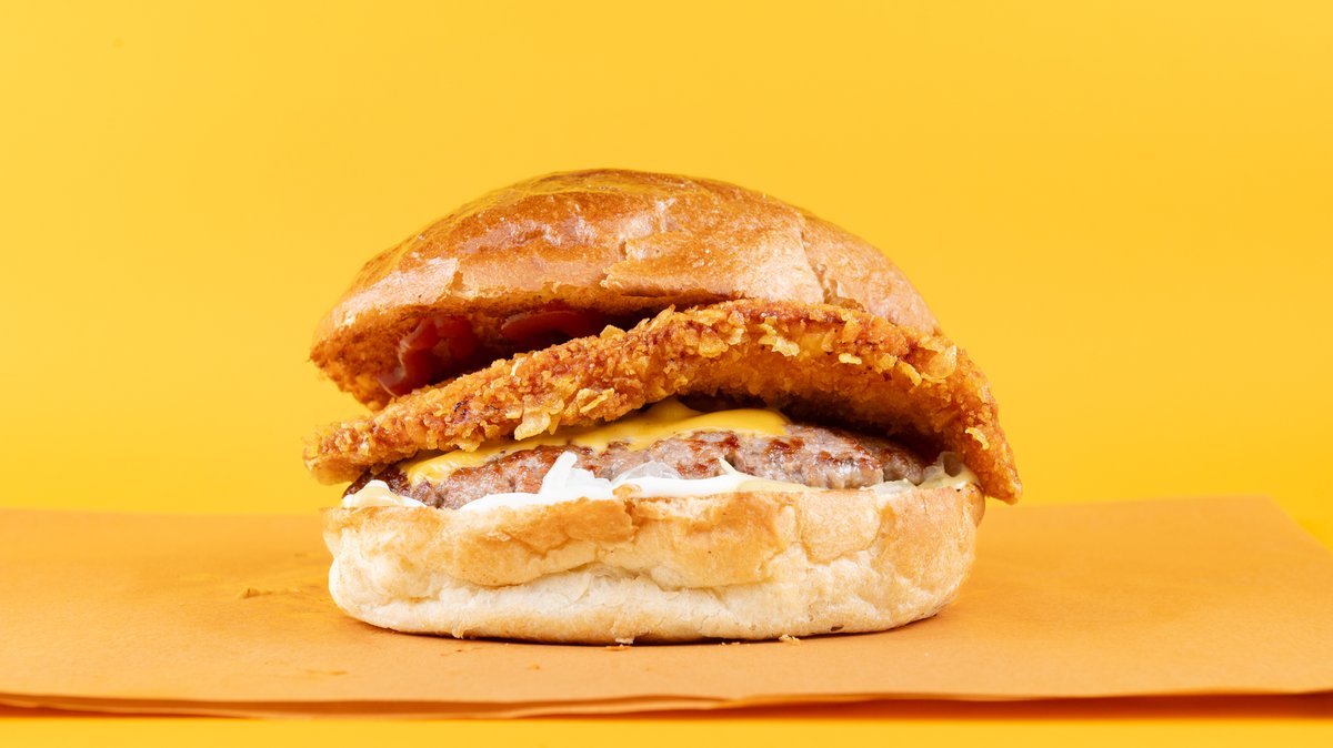 Μπιφτέκι μοσχαρίσιο 140gr, τηγανητό κοτόπουλο, cheddar, κρεμμύδι, μαγιονέζα, ketchup, μουστάρδα.
