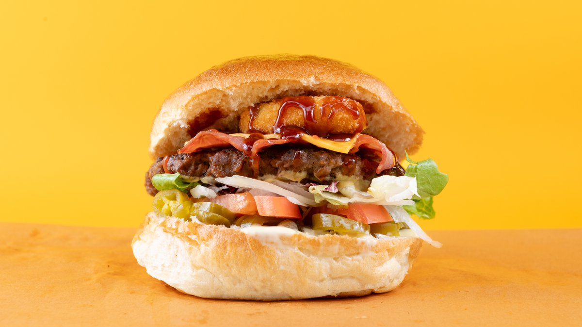 Μοσχαρίσιο μπιφτέκι 140gr, cheddar, bacon, πανέ τυρομπουκιά με cheddar και jalapenos, ντομάτα, κρεμμύδι, πίκλες jalapenos, iceberg, honey mustard sauce, bbq sauce.