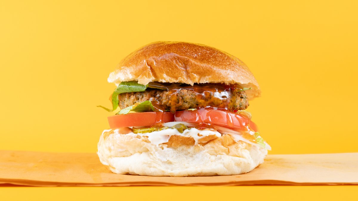 Μπιφτέκι βρώμης με μπρόκολο, iceberg, ντομάτα, πίκλες, κρεμμύδι, vegan μαγιονέζα, sweet chilli sauce.