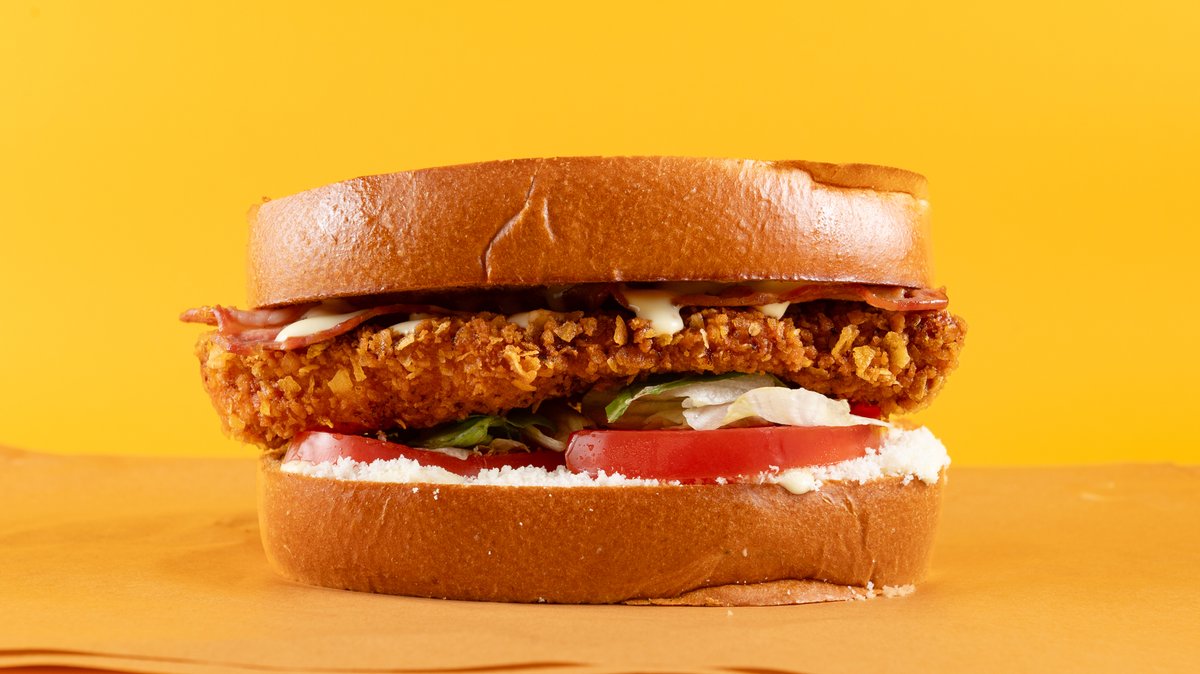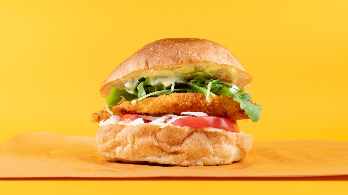 Ψωμάκι brioche με τηγανητό κοτόπουλο, παρμεζάνα, bacon, ντομάτα, iceberg και sauce honey mustard