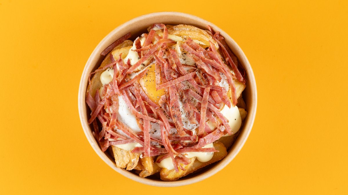 Πατάτες τηγανητές τραγανές μπαχαρωμένες με μπέικον, τηγανητό αυγό και honey mustard sauce