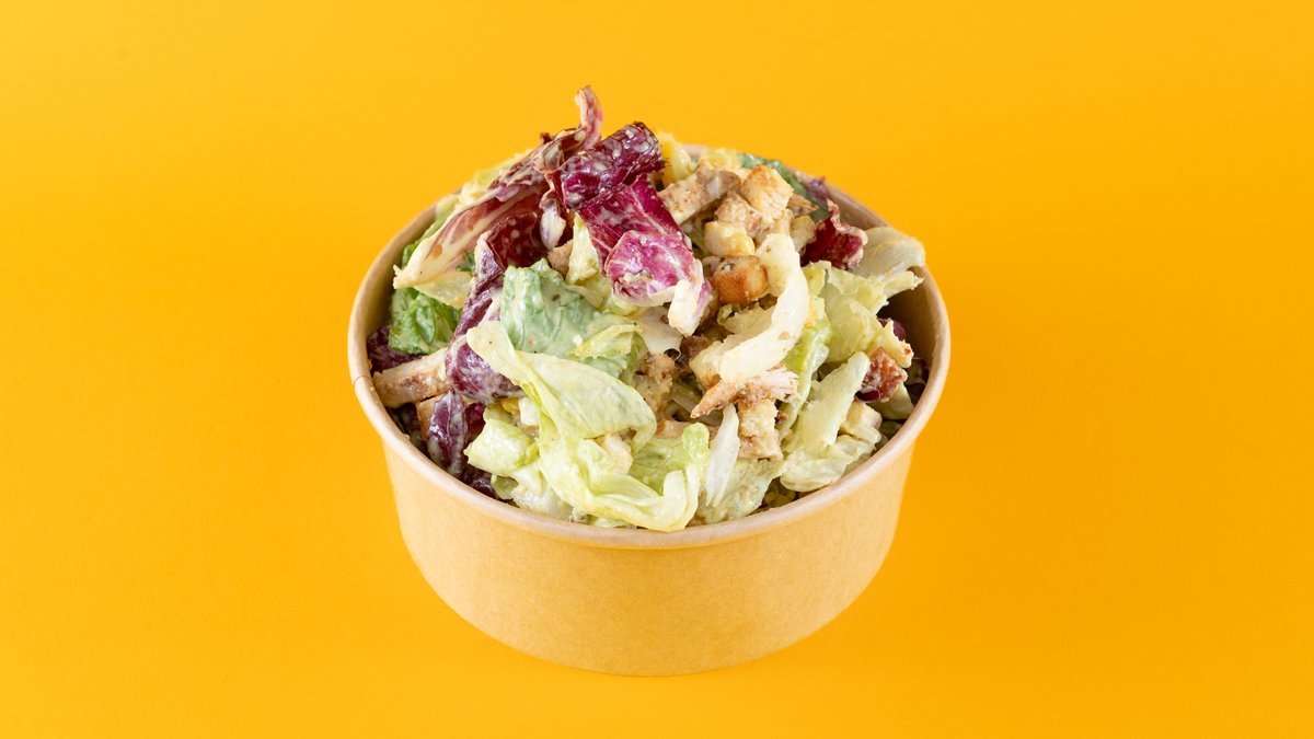 Σαλάτα με λεπτοκομμένο δροσερό μαρούλι, καλαμπόκι, φιλετάκια κοτόπουλο, παρμεζάνα, κρουτόν και Caesar's sauce