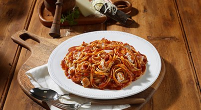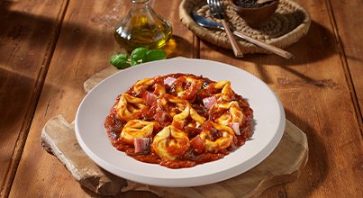 Με φρέσκα ζυμαρικά tortellini, αρωματική σάλτσα ντομάτας, ψημένο μπέικον, καραμελωμένο κρεμμύδι και σκληρό τυρί.