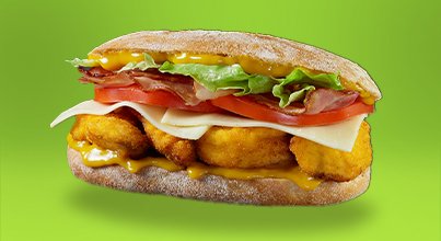 Φρυγανισμένες φέτες ψωμί του τοστ, Gouda, φιλέτο κοτόπουλου, μπέικον, ντομάτα, iceberg, βραστό αυγό, sauce μουστάρδας. Συνοδεύεται με πατάτες Crosscut.