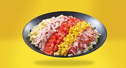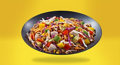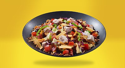 Iceberg, λάχανο άσπρο - κόκκινο, καρότο, κύβοι ντομάτας, ψημένο μπέικον, κοτόπουλο, crispy onion, πράσινη πιπεριά, φέτες Cheddar και BBQ sauce