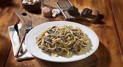 Με φρέσκα ζυμαρικά tortellini, πάστα τρούφας, κρέμα γάλακτος και σκληρό τυρί.