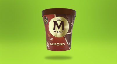 Απολαυστικό παγωτό βανίλια Magic, με τραγανές στρώσεις σοκολάτας στο εσωτερικό και σοκολατένια επικάλυψη σε κύπελλο που 'τα σπάει'! Παγωτό βανίλια με κομμάτια αμυγδάλου και σοκολάτας και τραγανή επικάλυψη σοκολάτας