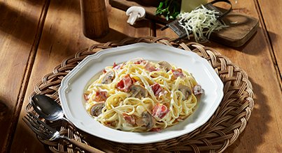 Κρεμώδης σάλτσα με κρέμα γάλακτος, ψημένο μπέικον και φρέσκα μανιτάρια. Συνοδεύεται από μπολάκι με σκληρό τυρί.