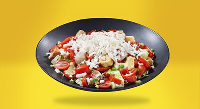 Με πολύχρωμες πιπεριές, γραβιέρα Νάξου, κοτόπουλο, κρέμα γάλακτος και μαϊντανό. Συνοδεύεται από μπολάκι με σκληρό τυρί.