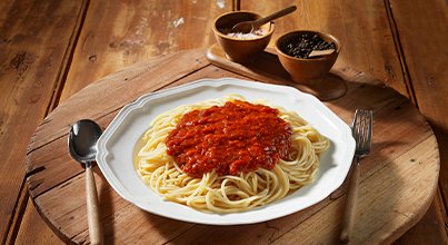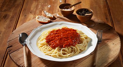 Με αρωματική κόκκινη σάλτσα ντομάτας. Συνοδεύεται από μπολάκι με σκληρό τυρί.