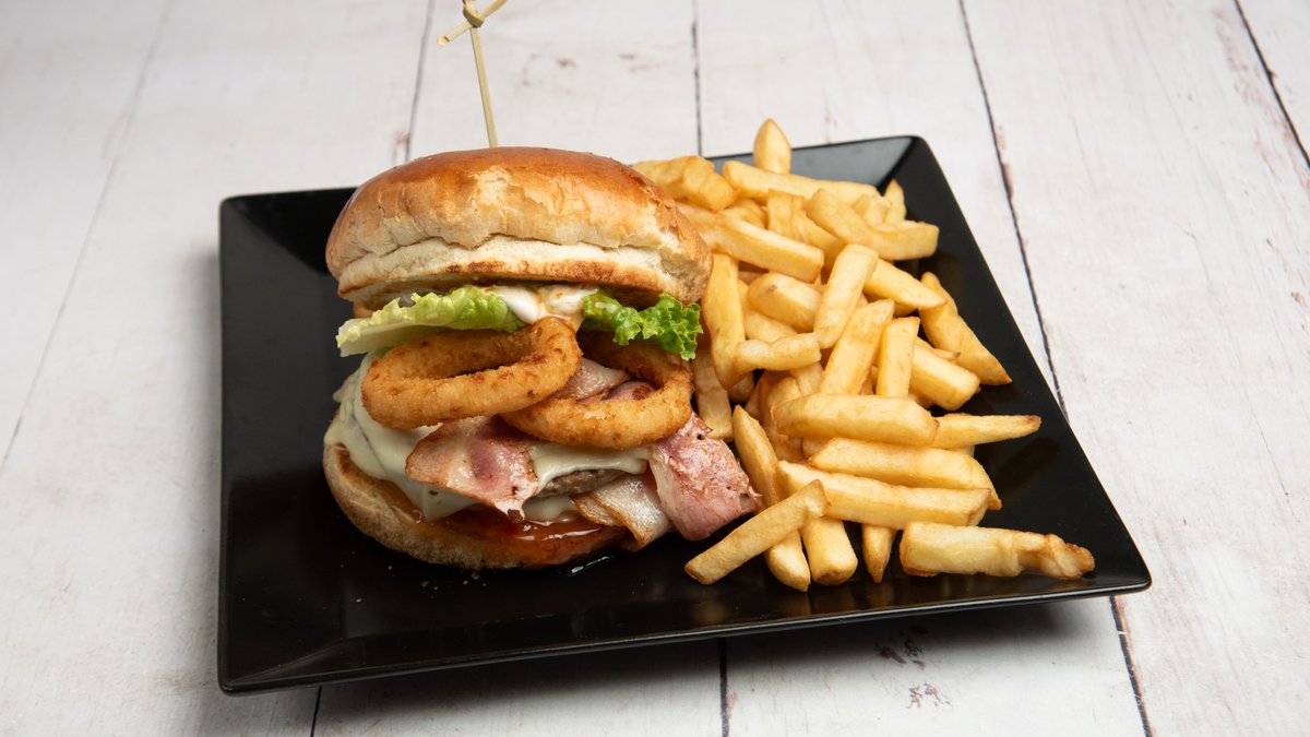 Διπλό μπιφτέκι, τυρί γκούντα. μπέικον, καυτερή σάλτσα τσίλι ή bbq σως, κρεμμύδι πανέ ροδέλες και πιπεριές jalapenos