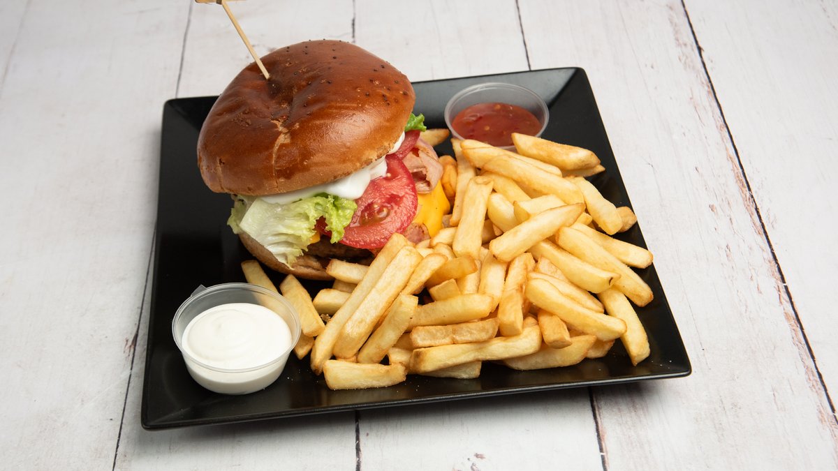 Τυρί, ζαμπόν, μπιφτέκι, κρεμμύδι τσιγαριστό, μαρούλι, ντομάτα και μαγιονέζα. Σερβίρεται με πατάτες τηγανητές