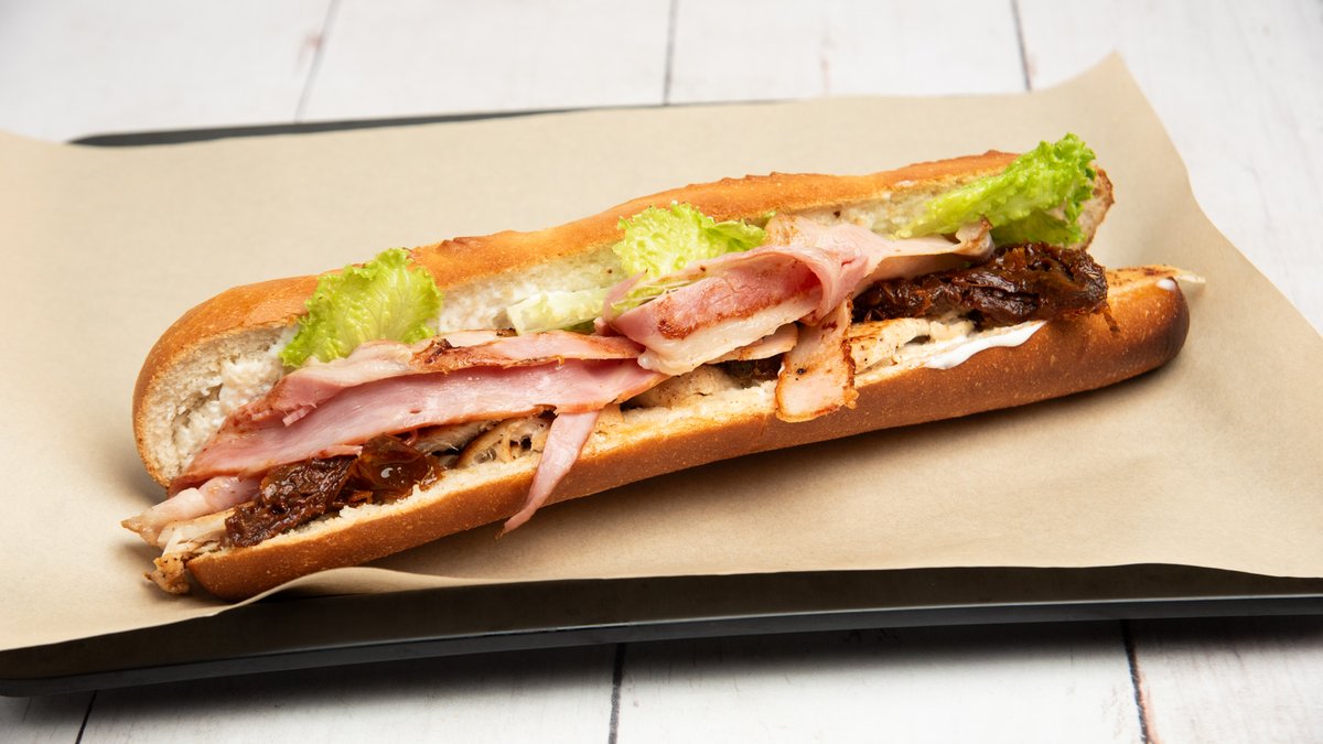 Κοτόπουλο φιλέτο, ζαμπόν ,τυρί, ντομάτα, μαρούλι και μαγιονέζα. Σερβίρεται με πατάτες τηγανητές
