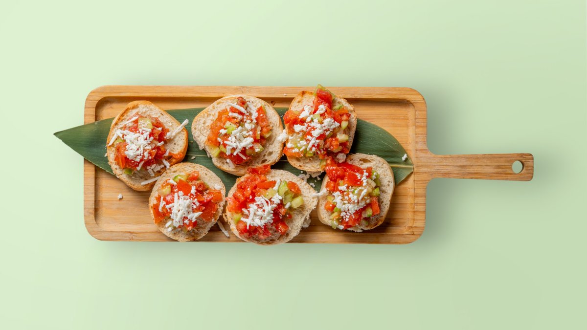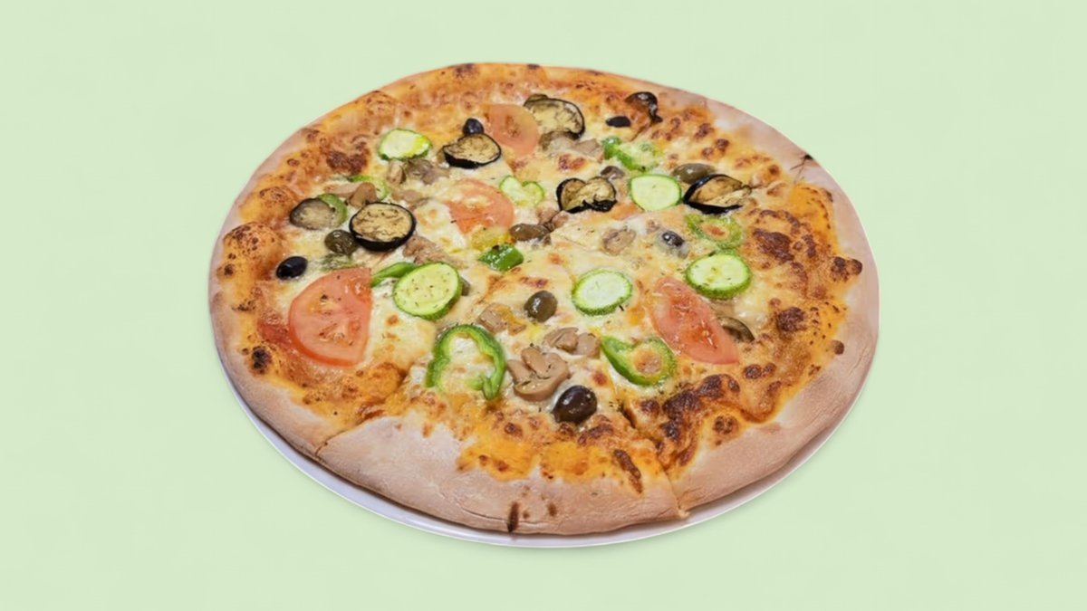 Salcë domateje, mocarela, kungull, speca, ullinj, patëllxhan dhe kërpudha