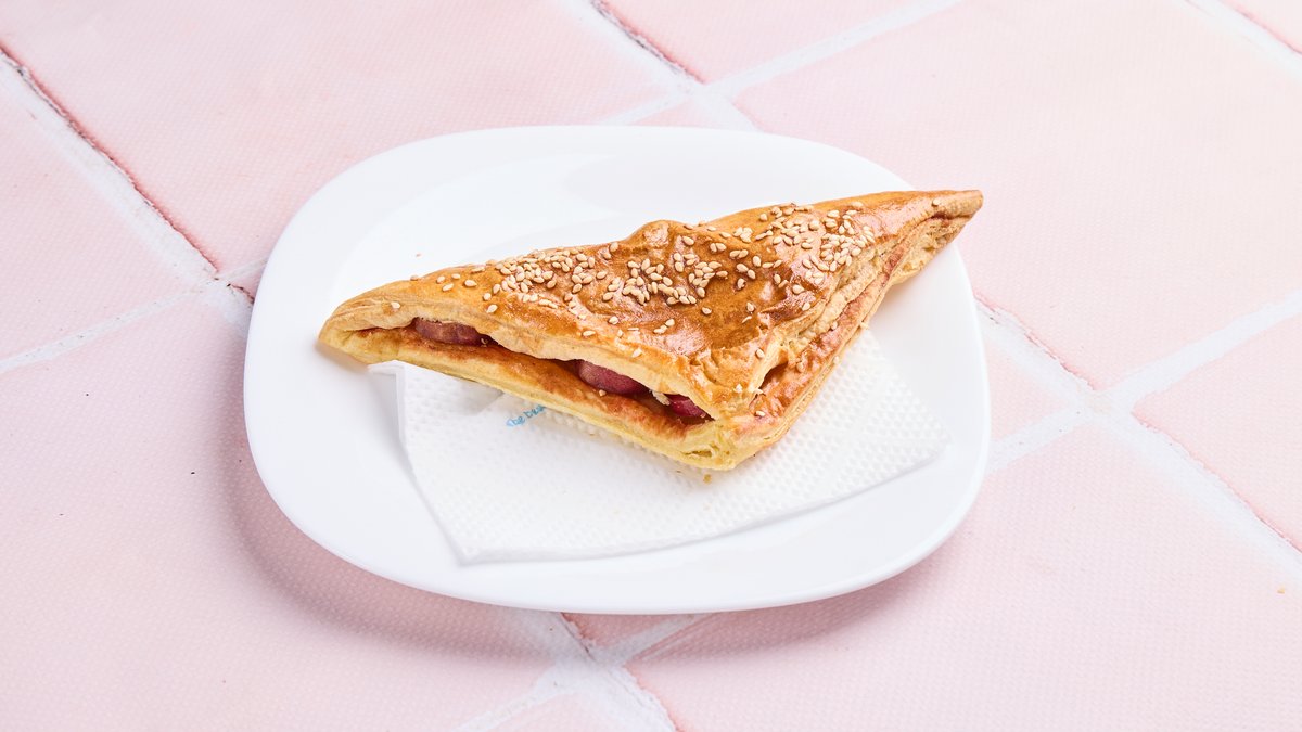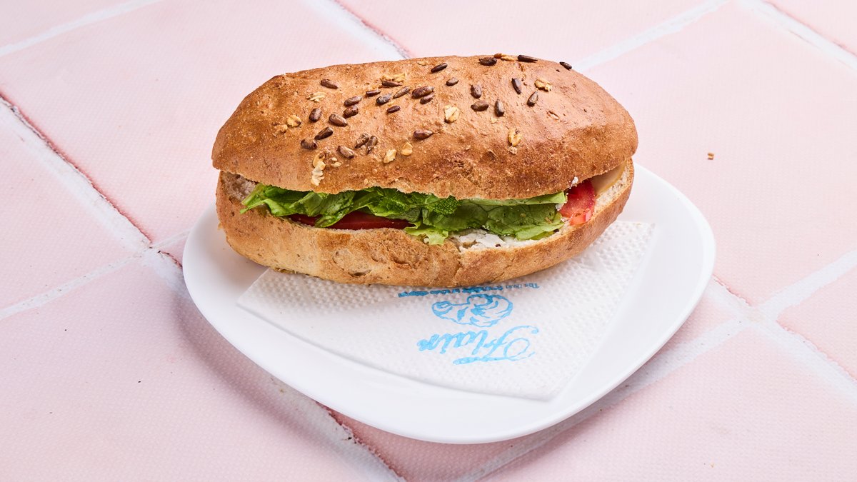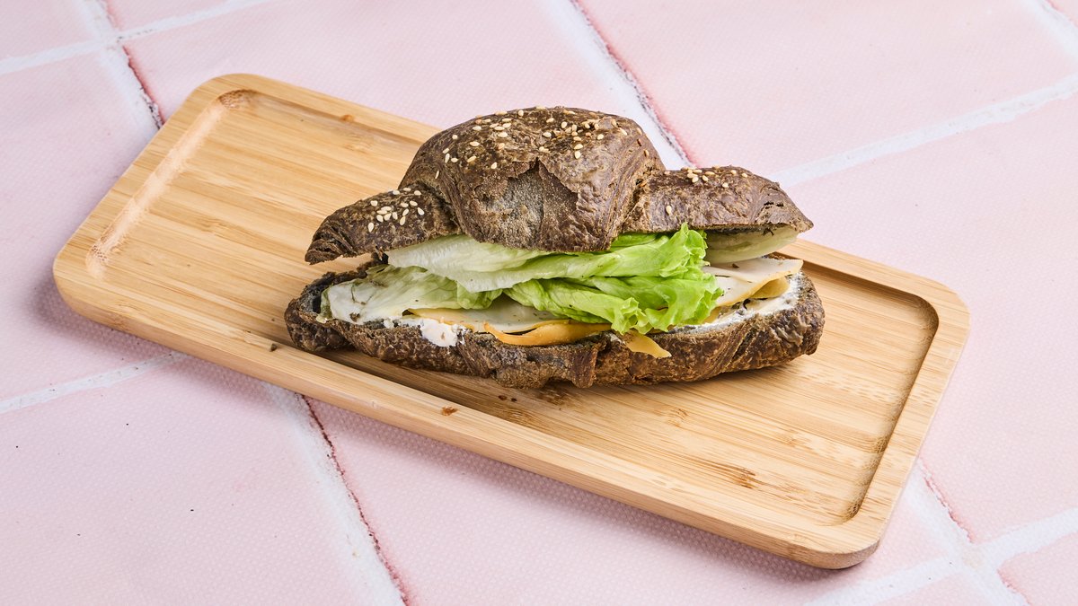 Charcoal Croissant Filled With Cream Cheese, Olives, Chicken Ham, Salad.