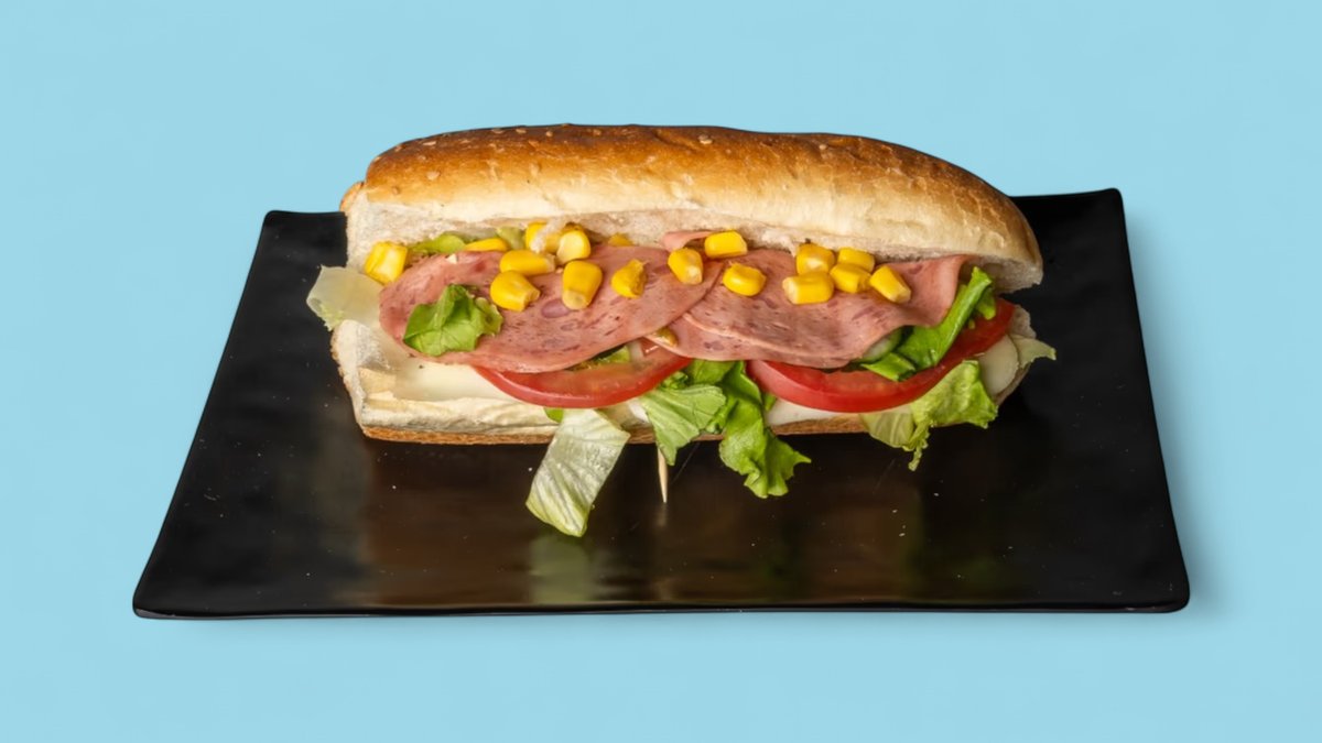 Salami, gouda, mayonnaise, tomatoes, cucumbers, peppers, olives