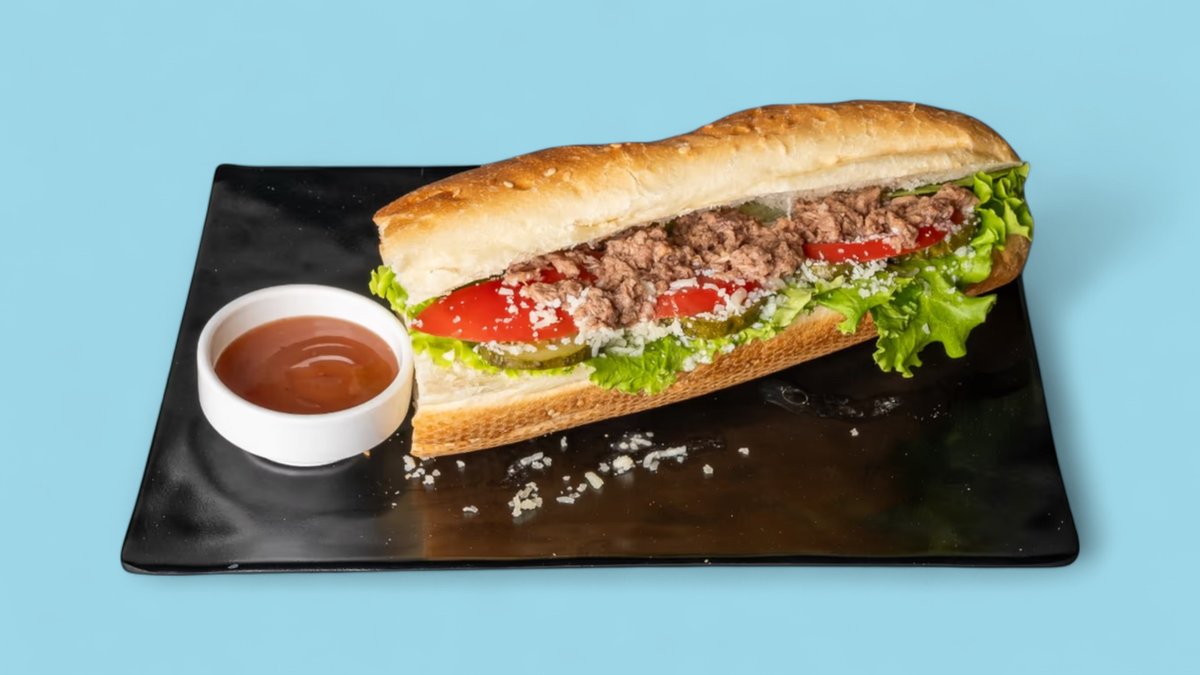 Cheese, pickles, beef, tomatoes, green salad, french fries, sauce, ketchup