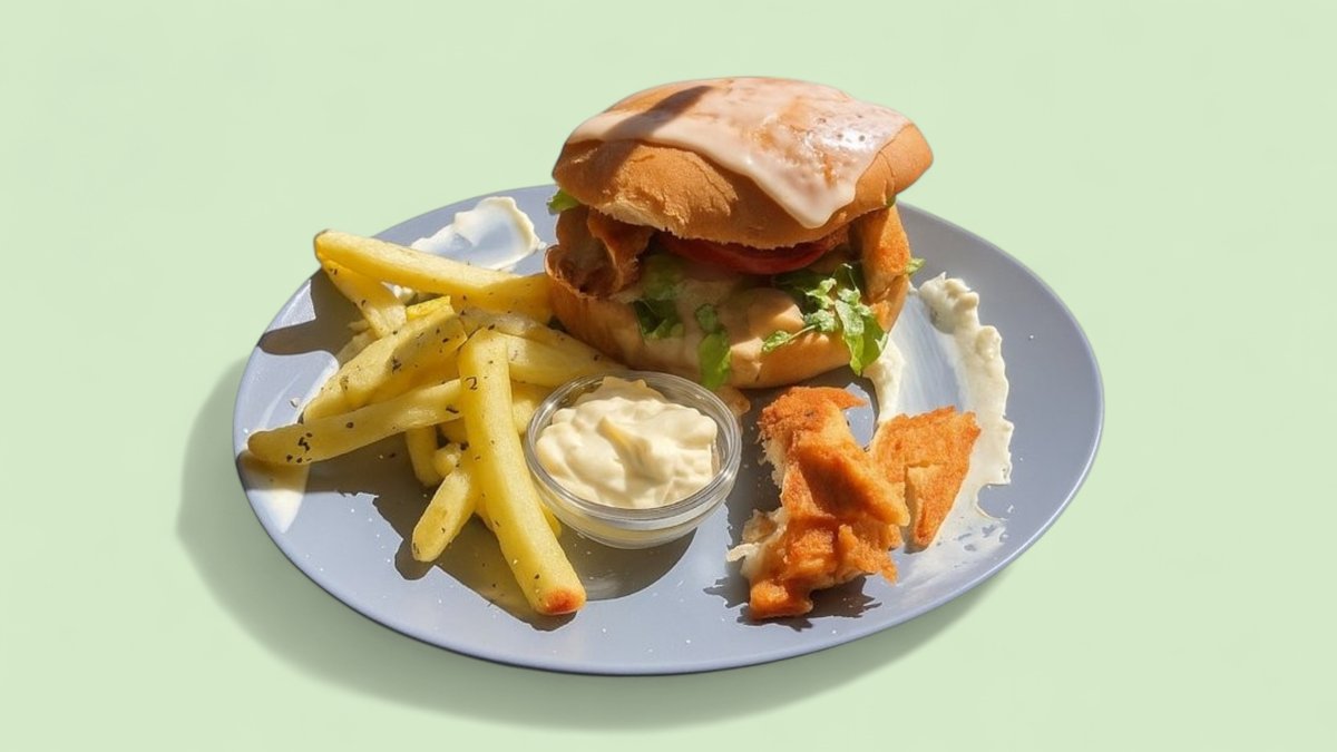 Fillet, pickled cucumber, green salad, tomato, french fries, sauce