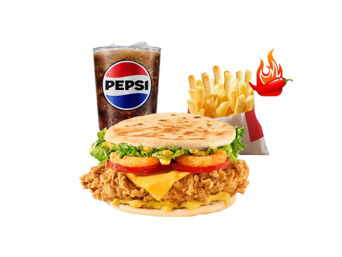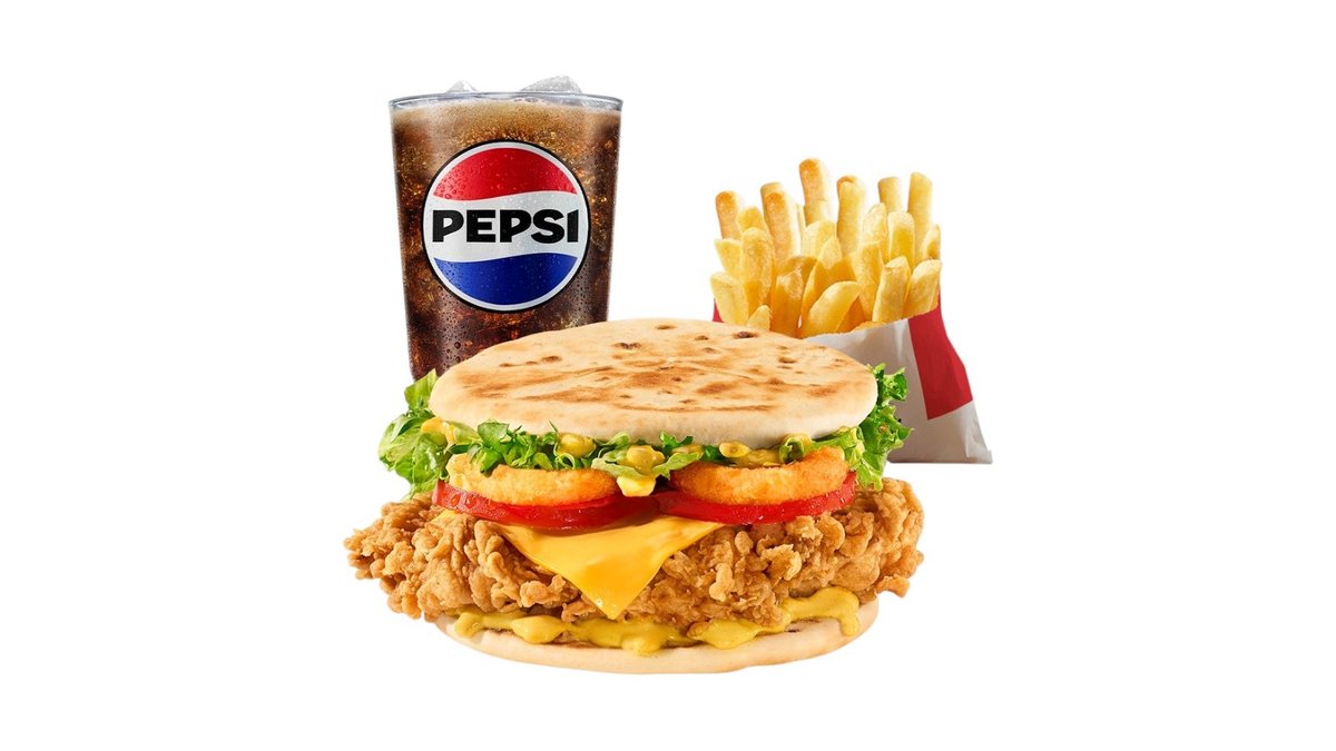 Majonezë, sallatë iceberg, fileto pikante, djathë cheddar, dip barbeque, hashbrown, kastravec turshi, dip supercharger, patate e mesme, pepsi