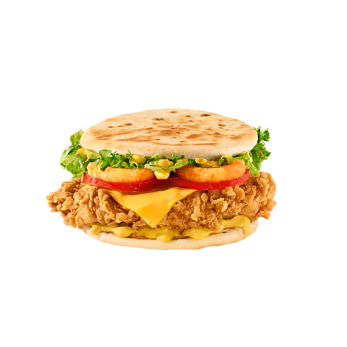 Majonezë, sallatë iceberg, fileto pikante, hashbrown, djathë, ketchup