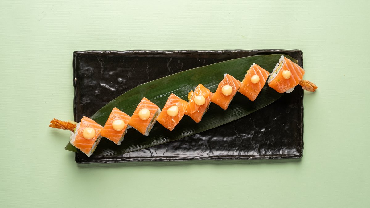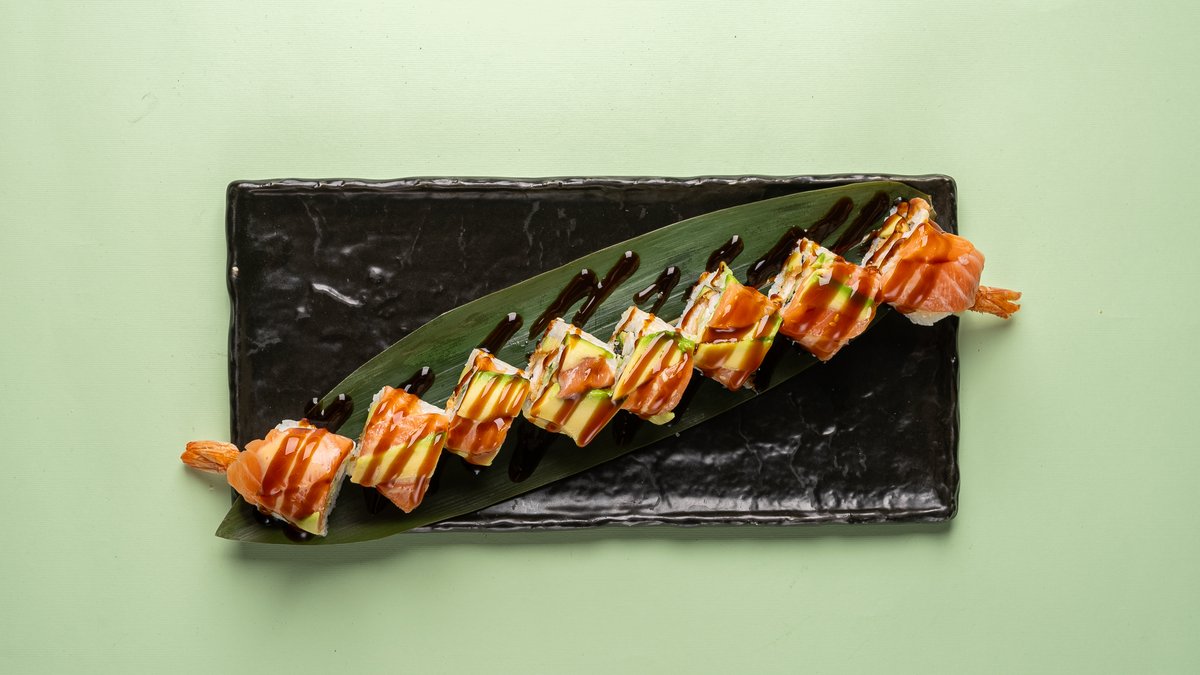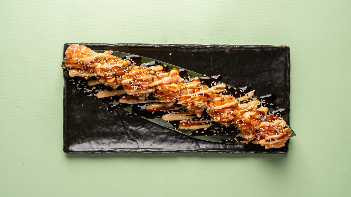 Shrimp tempura, salmon, crab, asparagus, spicy sauce, sesame