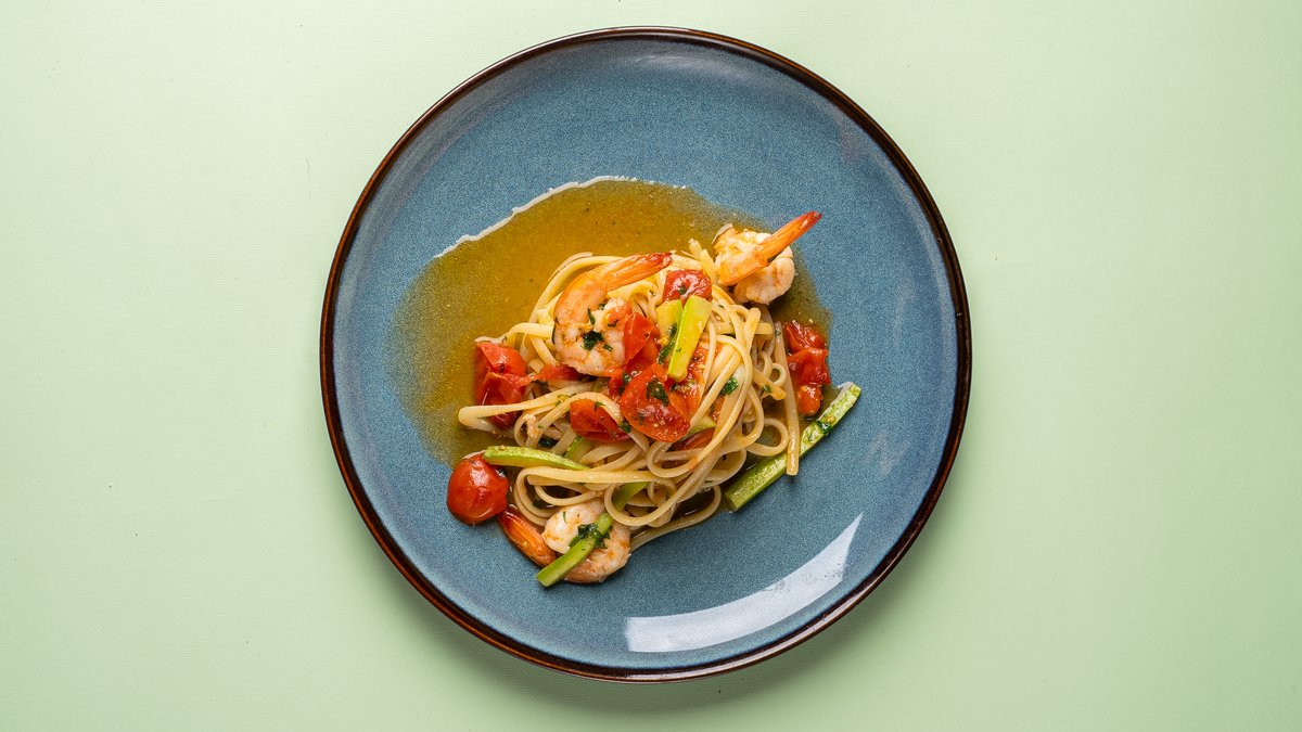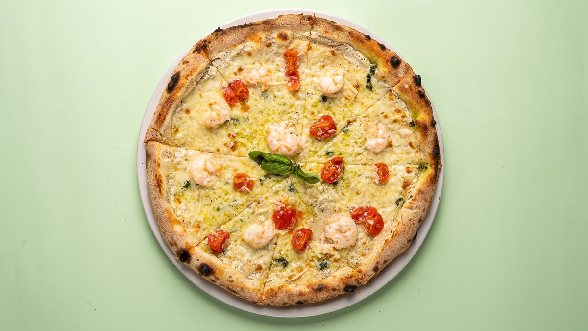 Truffle cream, mozzarella, shrimp, pomodorini, grana, basil oil