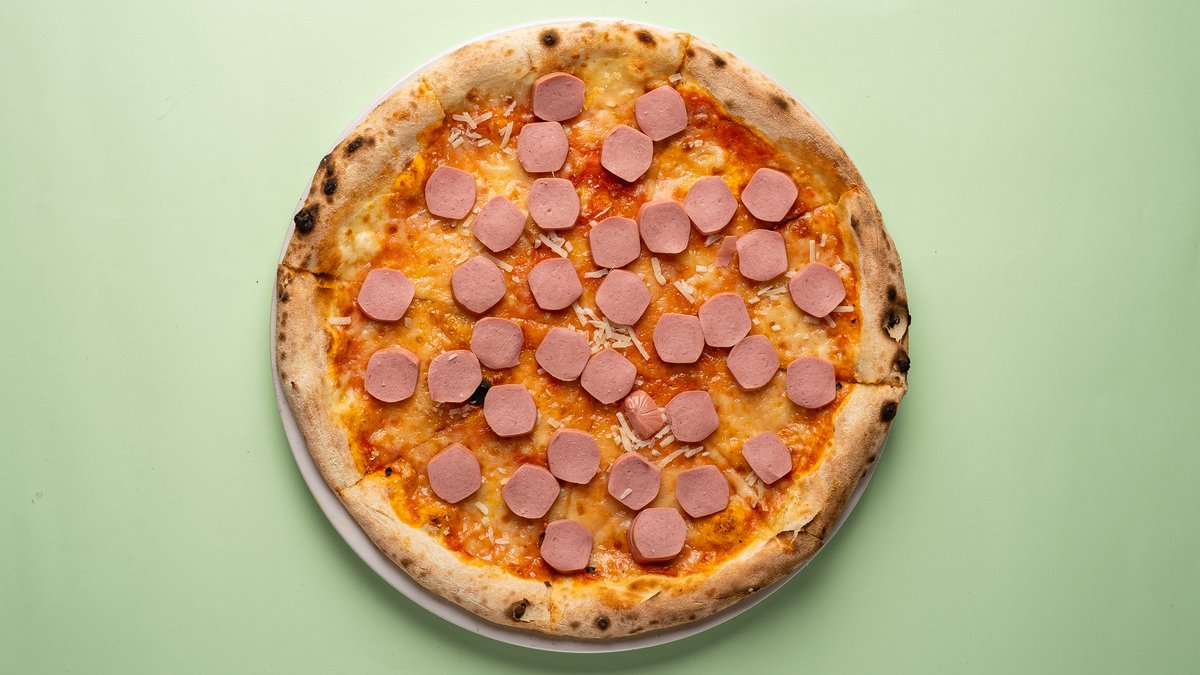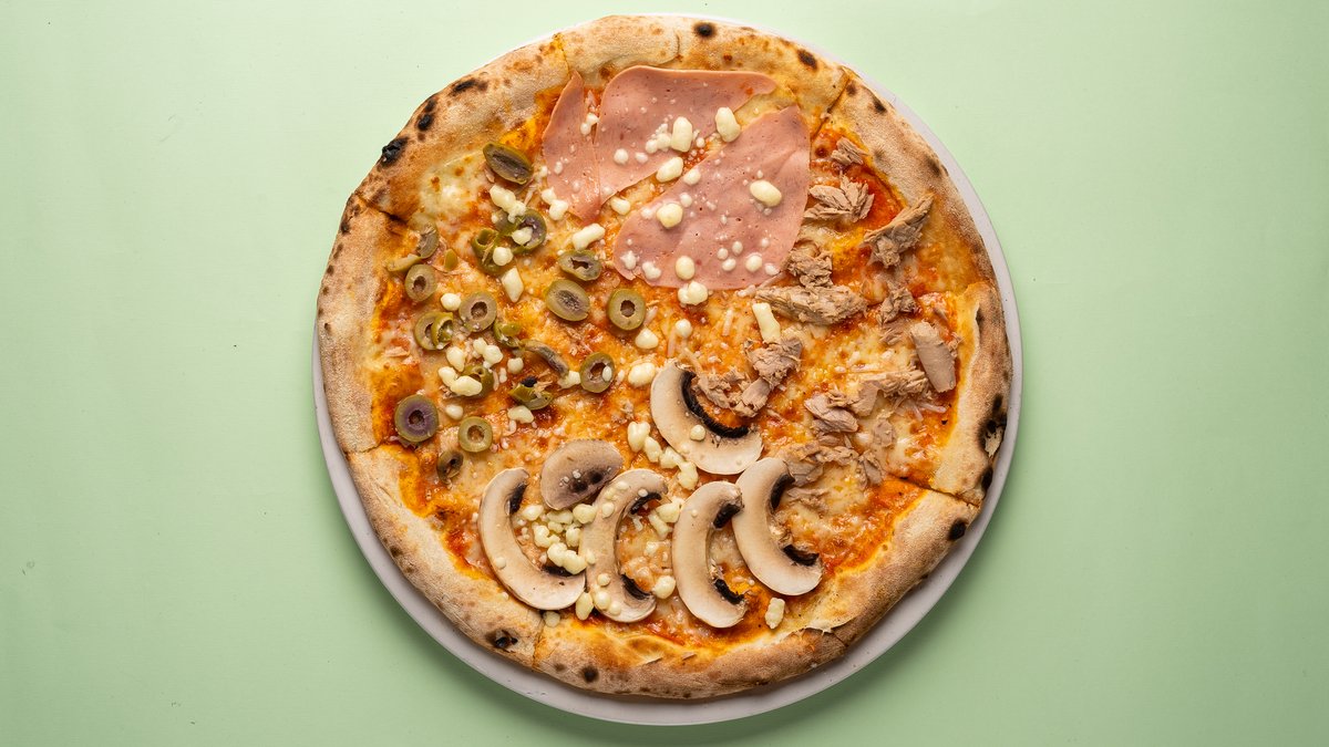 Sauce, mozzarella, ham, mushrooms, tuna, olives
