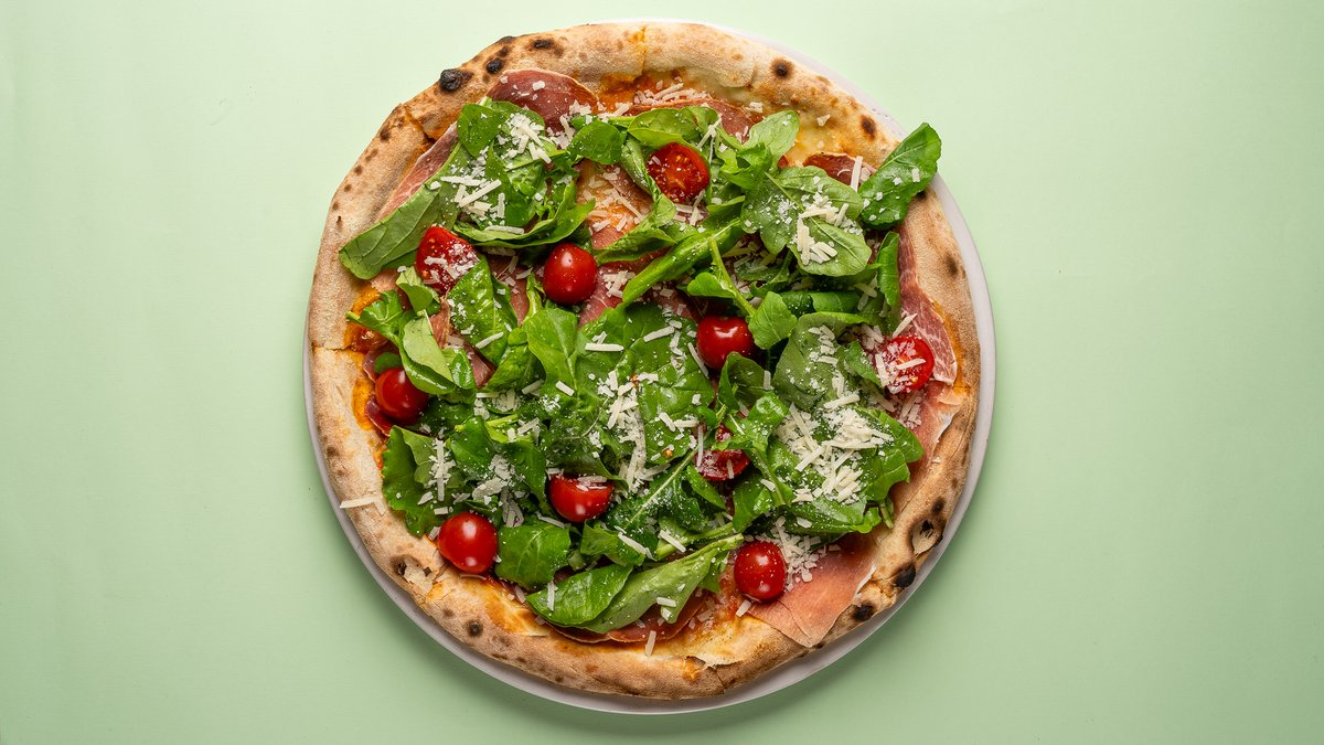 Sauce, mozzarella arugula pomodorini, crudo di parma, grana