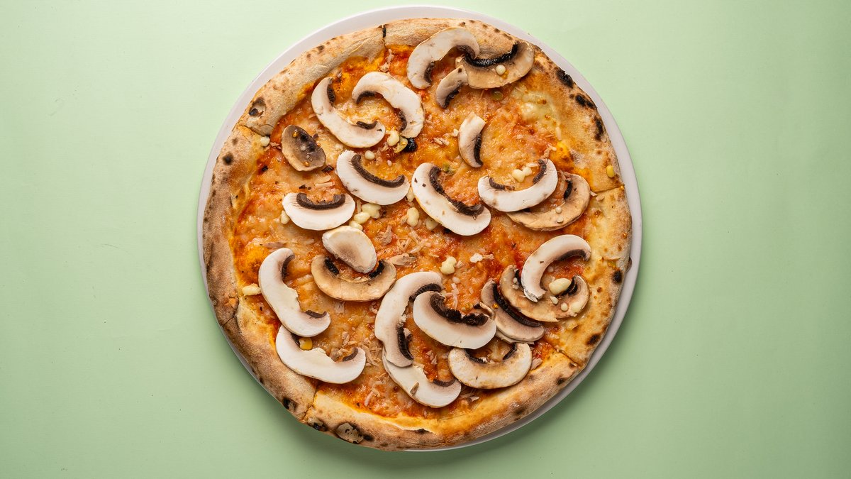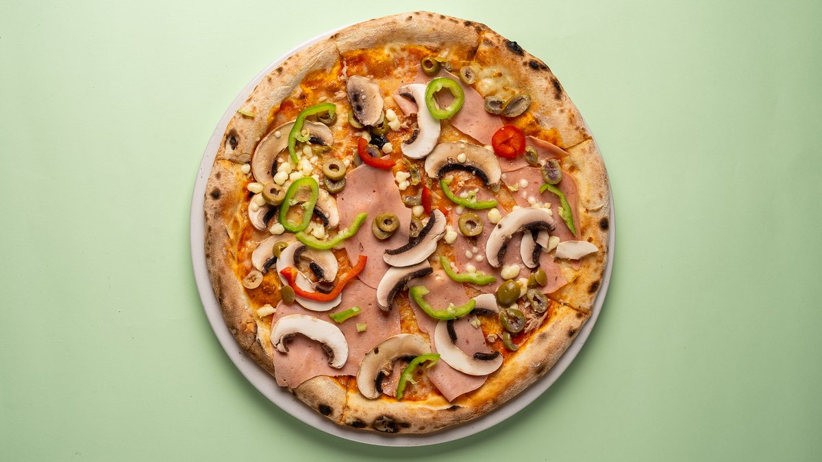 Sauce, mozzarella, mushrooms, peppers, olives, corn, pomodorini