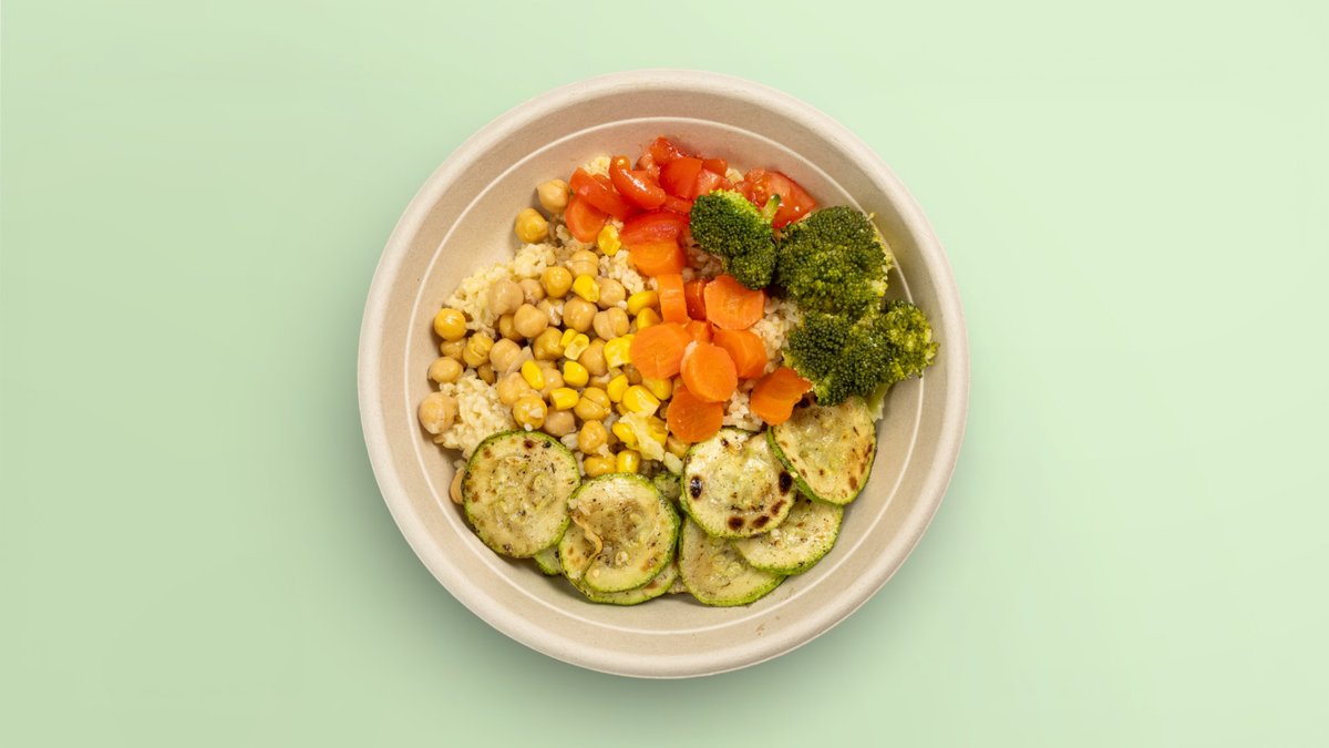 Bullgur, qiqra, misër i ëmbël, kungull jeshil, avokado, spec, 2 vezë të ziera, dressing