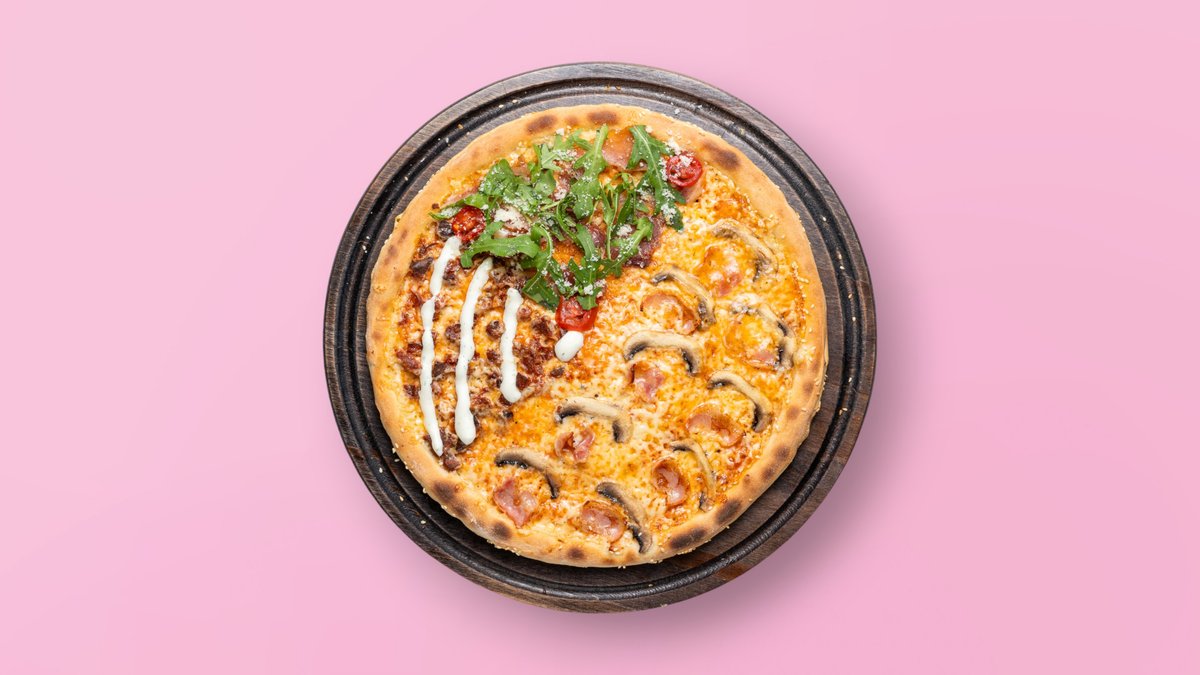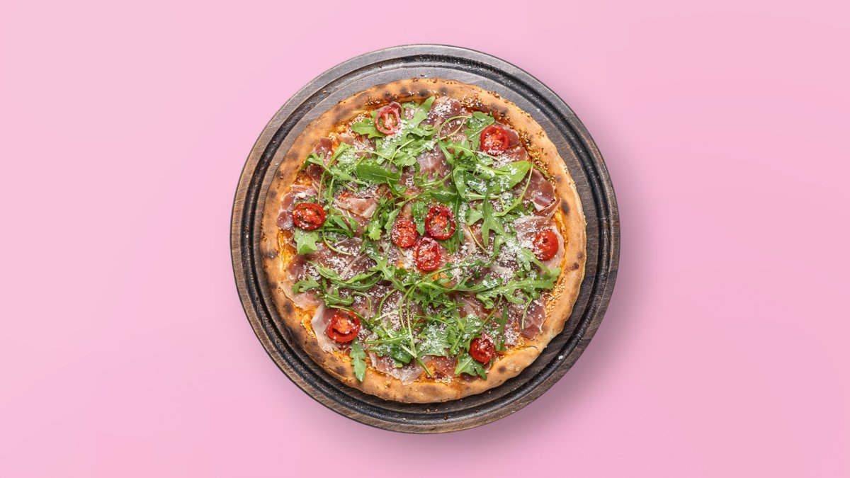 Sesame, marinated sauce, ham, cheese, bacon, fresh mushrooms, crudo, arugula, pomodorini, pecorino