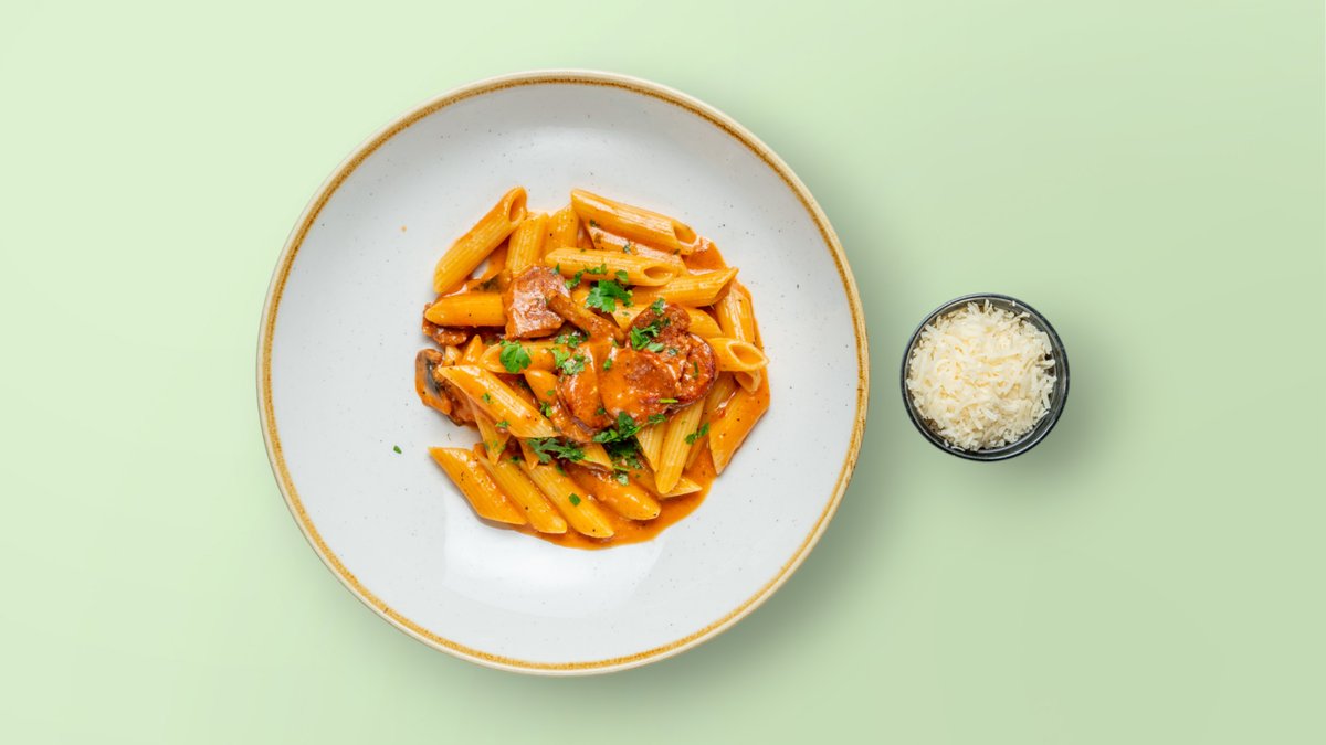 Penne, suxhuk kosove, kërpudha cremini, salcë rozë