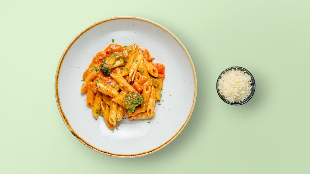 Penne, kungull, speca të kuq, brokoli, salcë rozë