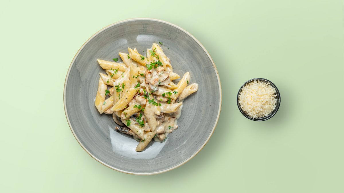 Penne, krem qumështi, pulë e freskët, kërpudha cremini