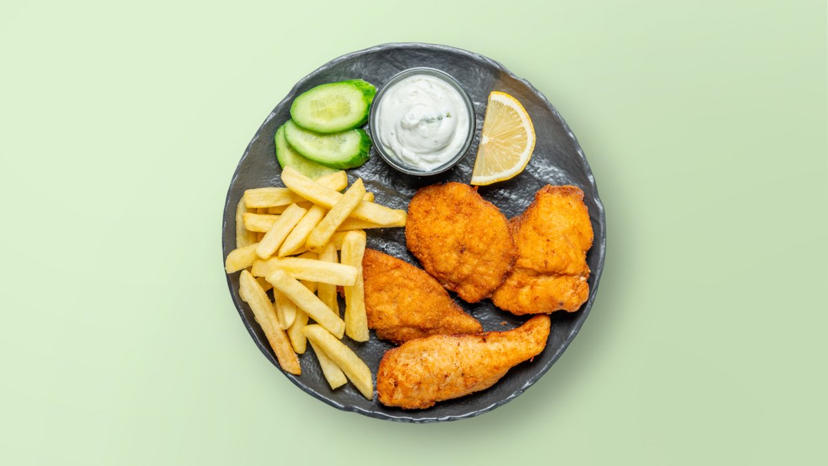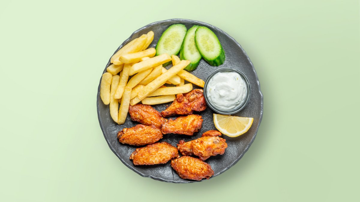 Qofte me mish pule, djathë, domate, patate, sallatë jeshile, ketchup, majonezë