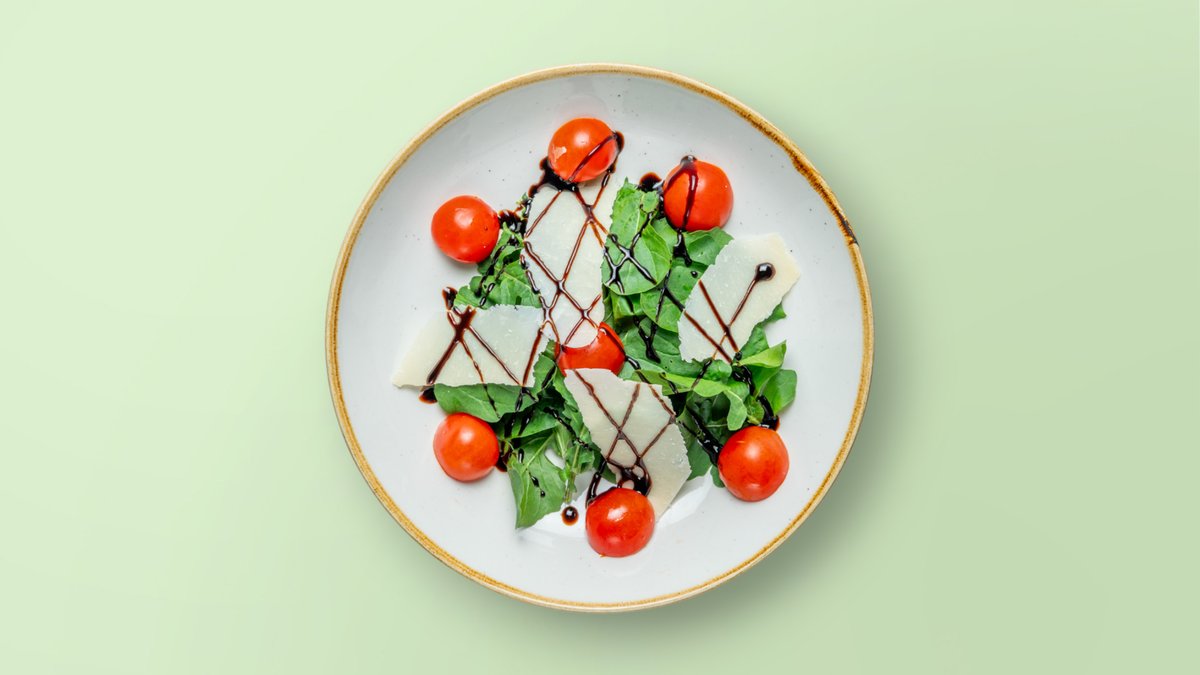 Rukola, salatë jeshile, pomodorini, parmigiano, shegë, krem balsamik